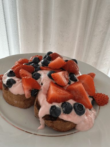 do zarumienienia. Na gotowe tosty wyłożyć skyr i posypać owocami.